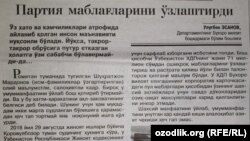Ўзбекистон халқ-демократик партияси Бухоро вилоят кенгаши бош ҳисобчиси партия маблағларини талон-тарож этишда айбдор деб топилди (“Ҳуқуқ”, 23 май).